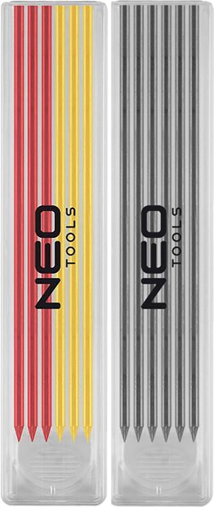 Werkplaats-, timmer- en metselwerkpotlood met geïntegreerde puntenslijper, aangeboden in een set met 12 grafietvullingen in drie kleuren: zwart, rood en geel.